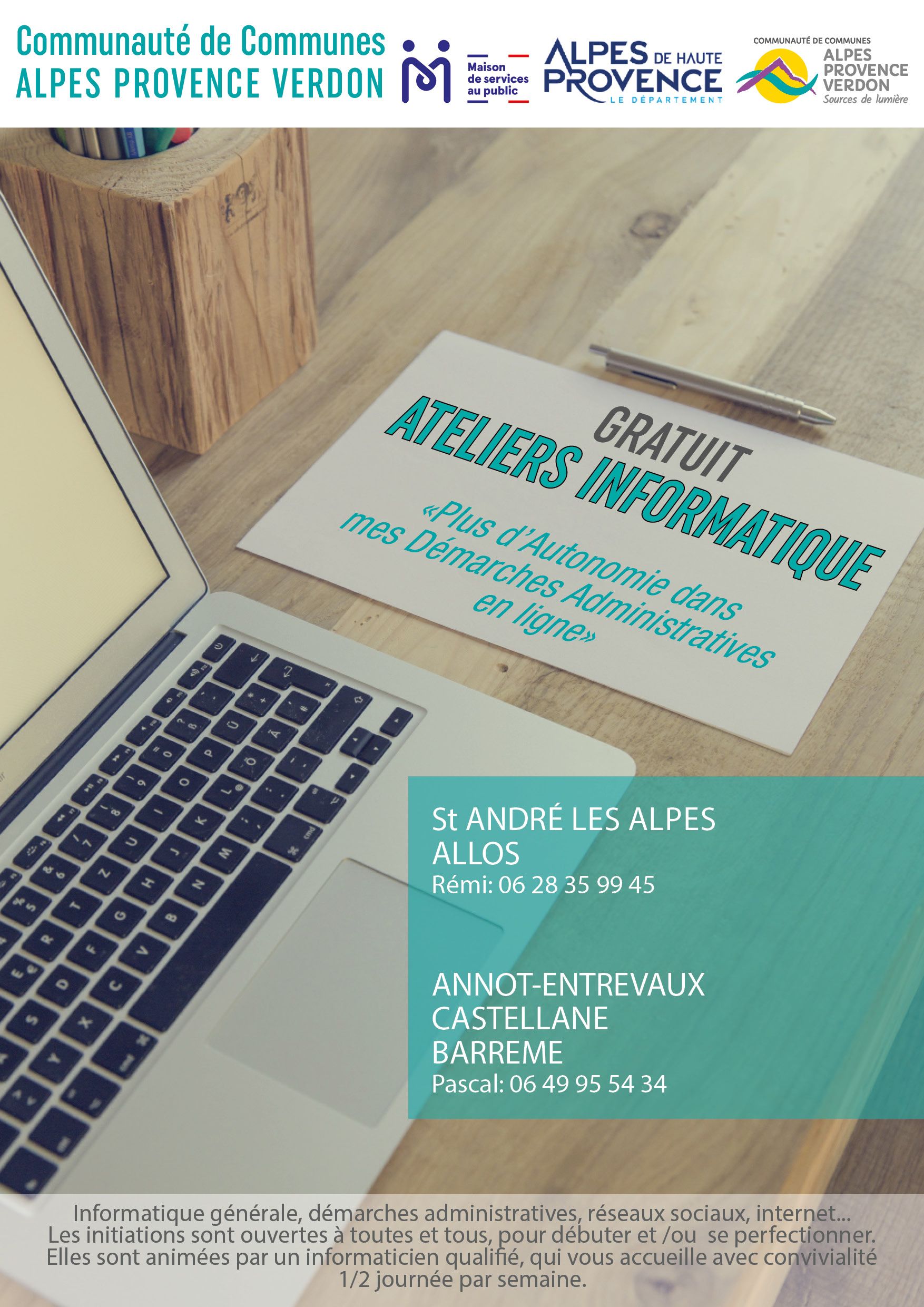 Des prestataires interviendront une 1/2 journée par semaine à la MSAP à Annot et à Entrevaux, à la MSAP à Castellane et à la médiathèque à Barrême, à la MSAP à St André et à la Médiathèque à Allos.