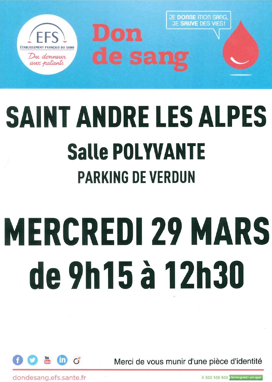 Nouvelles Don du sang L’ESF organise une collecte de sang le mercredi 29 mars 2017 de 9h15 à 12h30 à la Salle polyvalente de St André les Alpes.