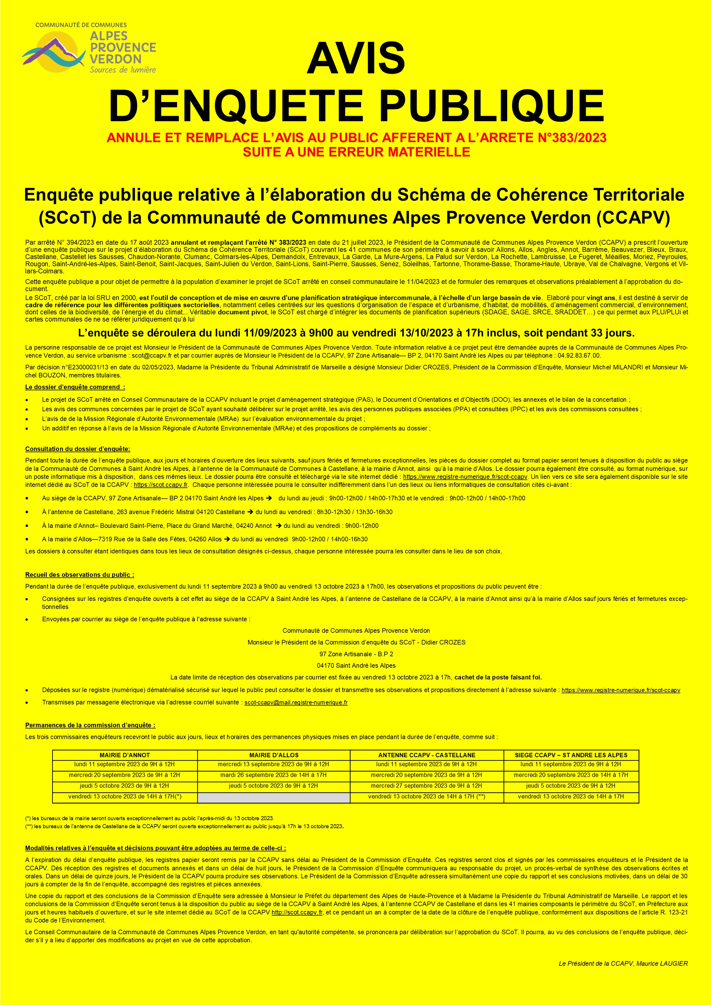 L'enquête publique relative à l'élaboration du Schéma de Cohérence Territoriale de la CCAPV se déroulera du 11/09/2023 9h00 au 16/10/2023 à 17h00 inclus.