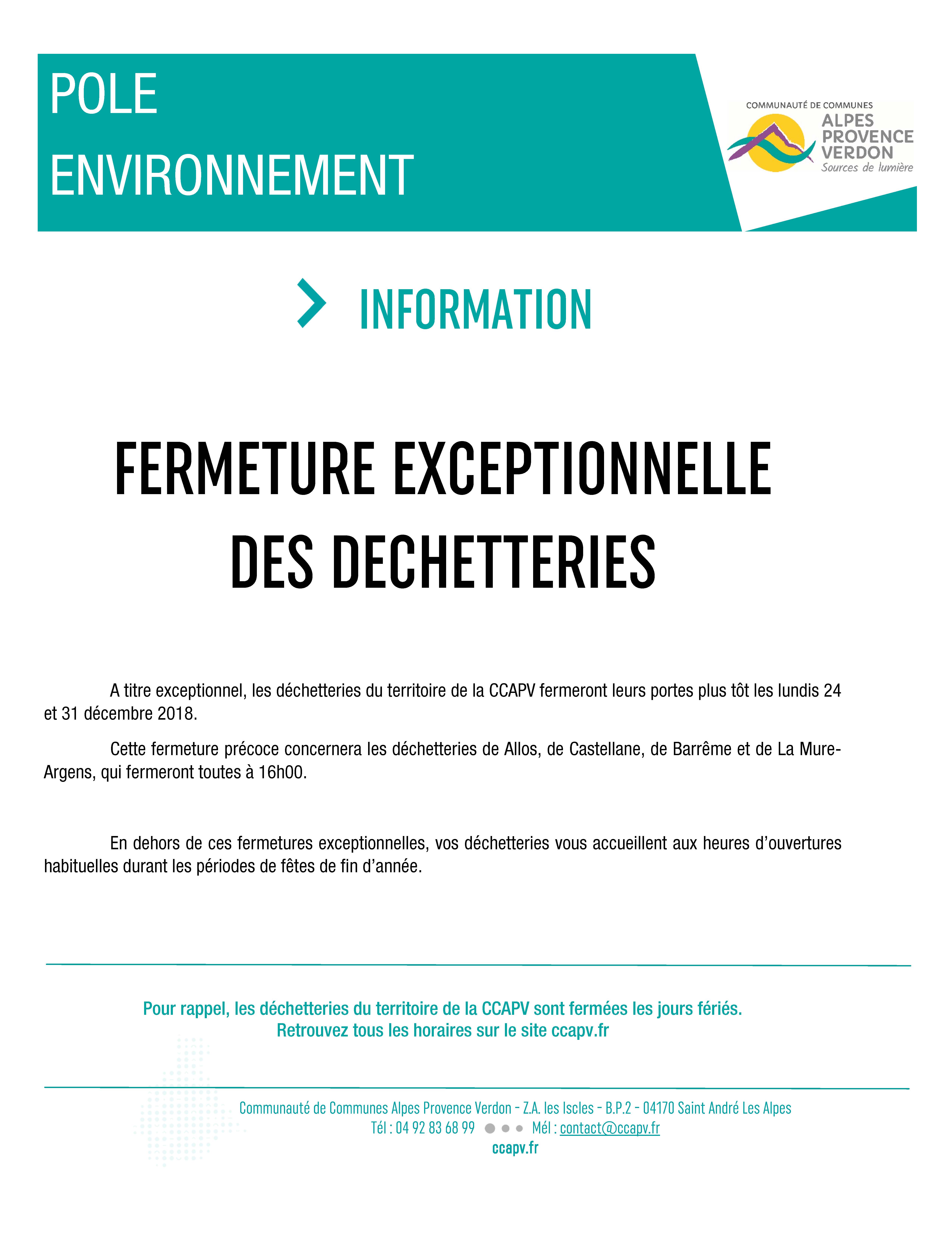 A titre exceptionnel, les déchetteries du territoire de la CCAPV fermeront leurs portes plus tôt les lundis 24 et 31 décembre 2018. --> Voir les déchetteries concernées
