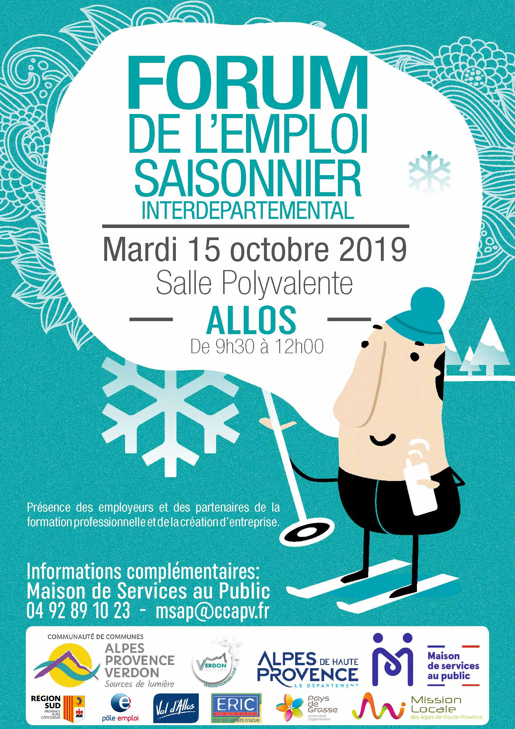 Les MSAP du territoire de la CCAPV et leurs partenaires préparent le 19eme forum de l’emploi. Ce forum aura lieu le 15 octobre 2019, de 9h30 à 12h00, dans la salle polyvalente mise à disposition par la commune d’Allos.