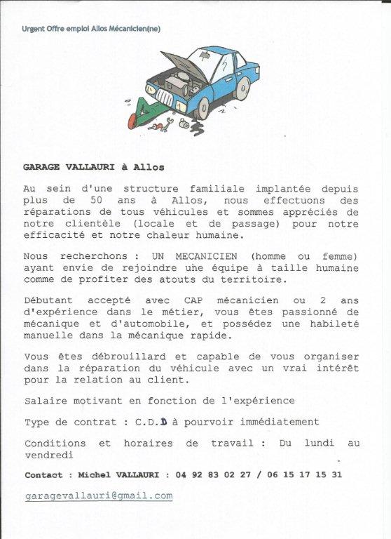 Mécanicien (ne) garage Vallauri à Allos