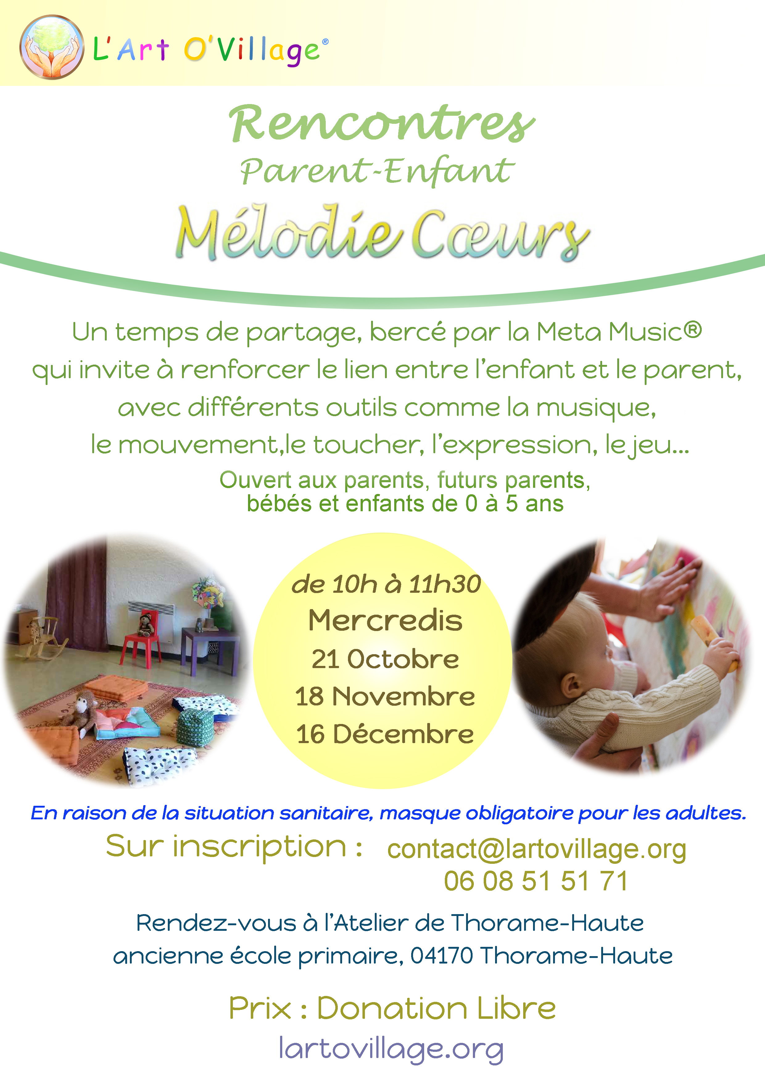 Nouvelles L'art o'Village C’est avec joie que nous vous partageons les nouvelles dates des rencontres Parent-Enfant Mélodie-Cœurs, qui reprennent un mercredi par mois à l’Atelier de Thorame-Haute (ancienne maternelle). plus d'infos