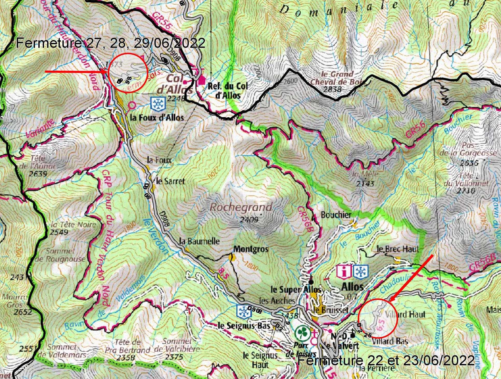 -La RD 908 du pied du col d'Allos jusqu'au sommet sera fermée à la circulation du 27 au 29 juin 2022 de 08h00 à 18h00.
