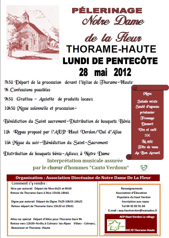 | Le programme de cette belle journée 7h45 départ de la procession 10h30 Messe à Notre Dame de la Fleur 12h Repas à la gare ( organisation AEP) 16h Messe du soir 20h repas (organisation Bon Accueil) |