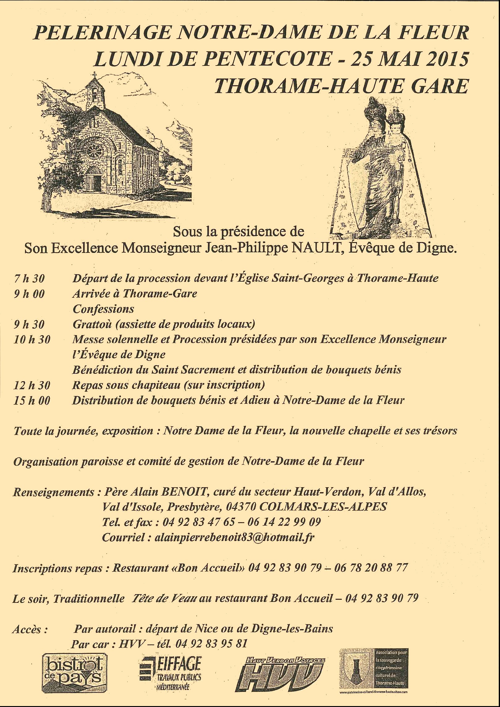 | Comme tous les Lundis de Pentecôte, ce 25 mai 2015 a eu lieu la procession à Notre Dame de la Fleur. Cette année une soixantaine de personnes se sont donnés rendez-vous à l'église St Georges de Thorame-Haute pour accompagner la statue de la vierge Marie dans son sanctuaire de notre Dame de la Fleur . La procession s'est mise en route à 7h30 pour arriver 2h plus tard à Thorame-gare. A noter cette année la présence de Monseigneur Jean-Philippe Nault évêque de Digne-les-Bains, Riez, Sisteron et l'exposition sur la construction de cette structure religieuse préparée par l’Association pour la Sauvegarde du Patrimoine Culturel de Thorame Haute. |