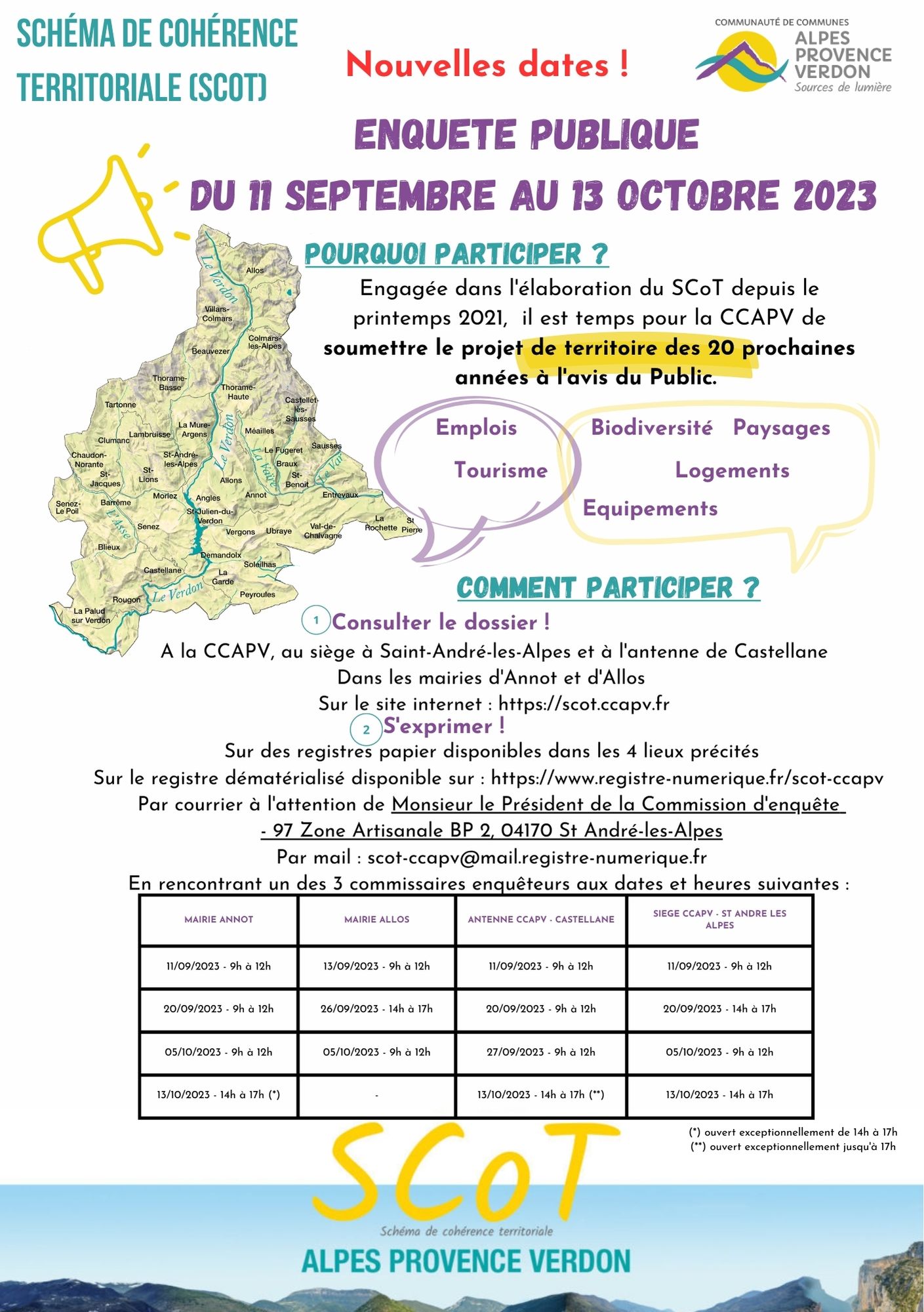 L'enquête publique relative à l'élaboration du Schéma de Cohérence Territoriale de la CCAPV se déroulera du 11/09/2023 9h00 au 16/10/2023 à 17h00 inclus.
