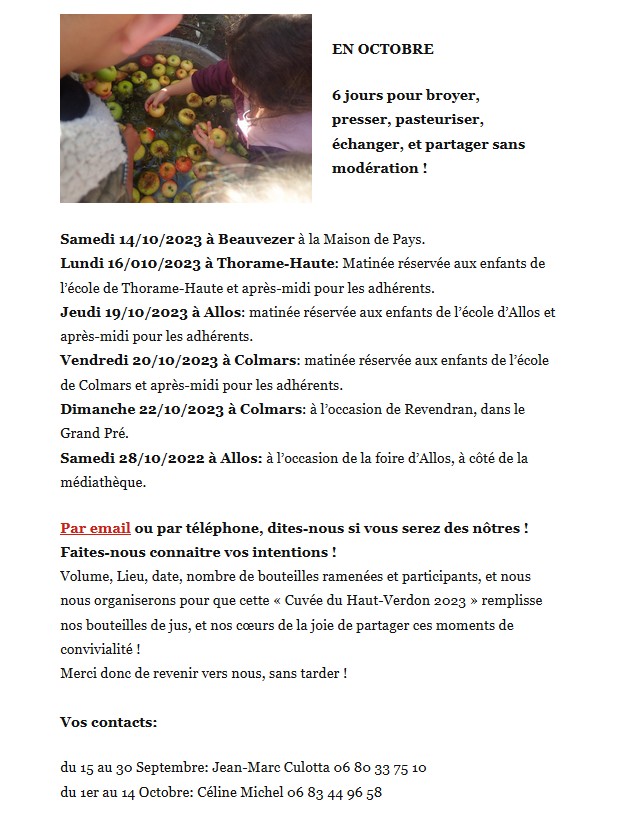 Les bénévoles de l'association Demain le Haut-Verdon vous ont préparé 6 jours pour broyer, presser, pasteuriser, échanger, et partager sans modération !